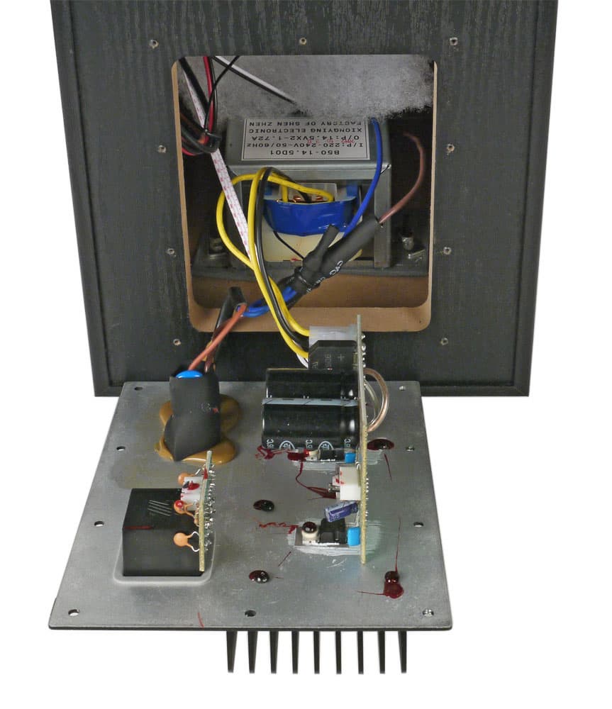 Усилители мощности выполнены на двух сдвоенных интегральных УНЧ TDA7265, для охлаждения которых используется металлическая крышка выреза в задней стенке активной колонки с дополнительным ребристым радиатором; место крепления крышки снабжено уплотнителем. На одной плате с УНЧ находится и выпрямитель с двумя конденсаторами по 6800 мкФ, напряжение на который подается с низкочастотного трансформатора на Ш-образных пластинах (2×15 В, 3,5 А), который закреплен на днище колонки через амортизирующую прокладку. В цепь его первичной обмотки включен предохранитель, доступный снаружи.