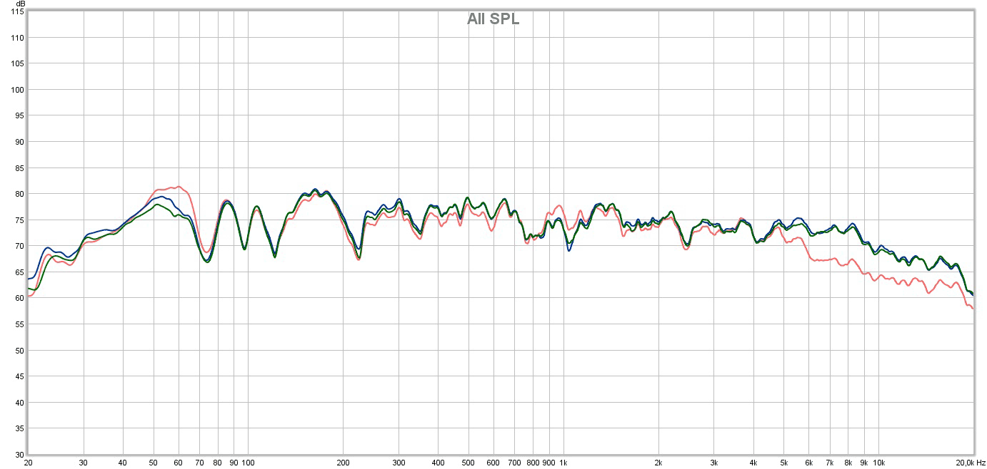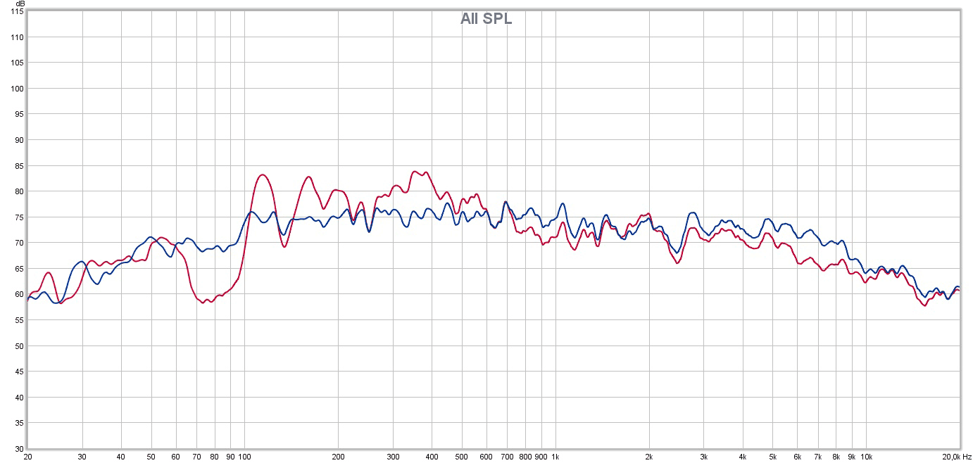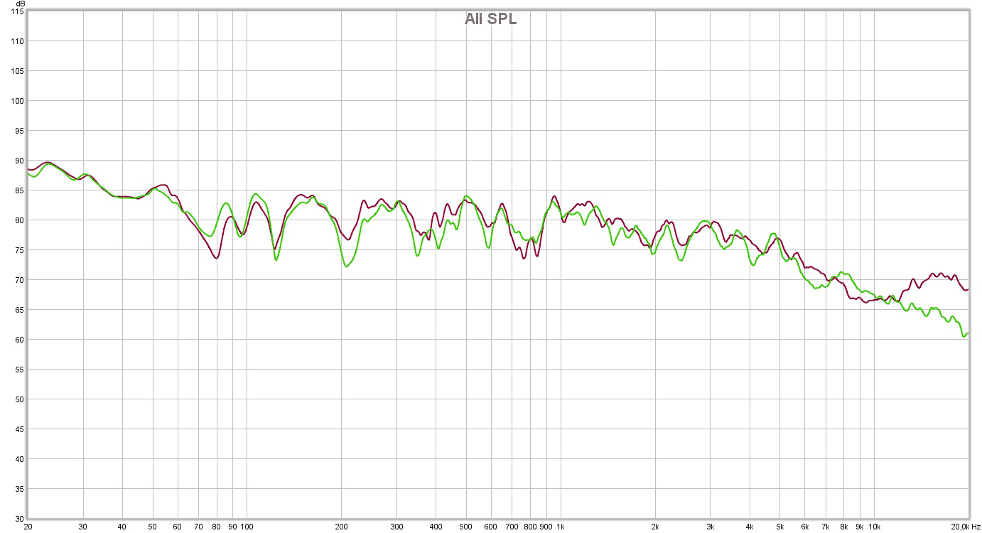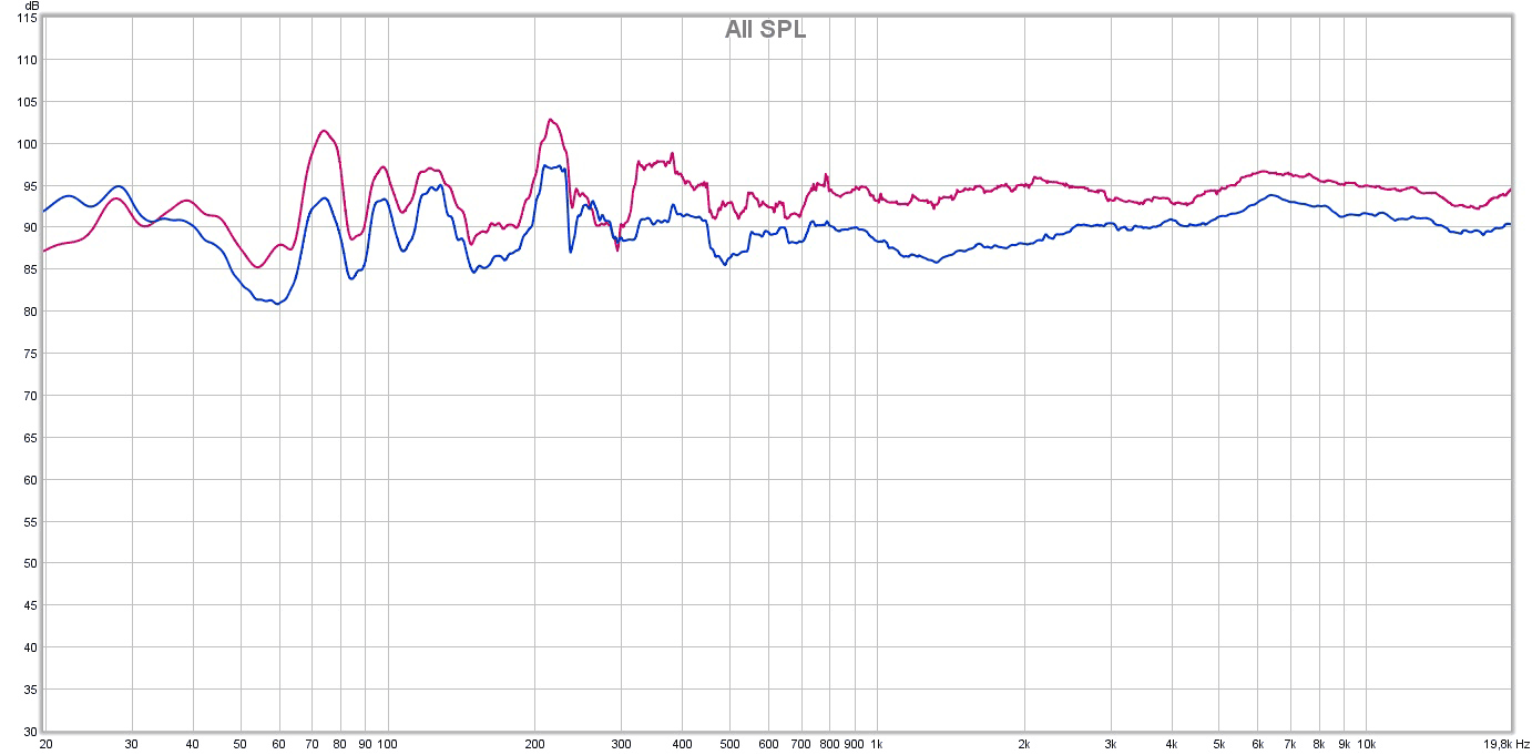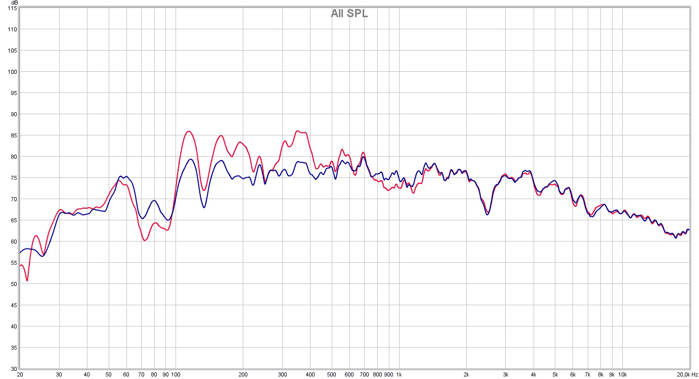 Графики систем MCACC и YPAO практически совпадают в области частот от 100 Гц до 800 Гц, далее до 3 кГц в YPAO наблюдается небольшой провал — видимо, связанный с тем, что тыловые каналы правятся лишь минимально. В области работы сабвуфера разница порядка 7 дБ, чему пока тяжело дать объяснение. Возможно, разница связана с ошибками замеров, либо какие-то каналы были установлены у системы MCACC в Large (без среза на сабвуфер), или, возможно, системы по-разному отрабатывают разложение стереосигнала одновременно на 5 каналов.