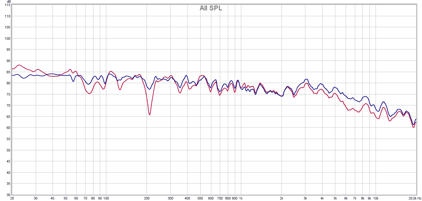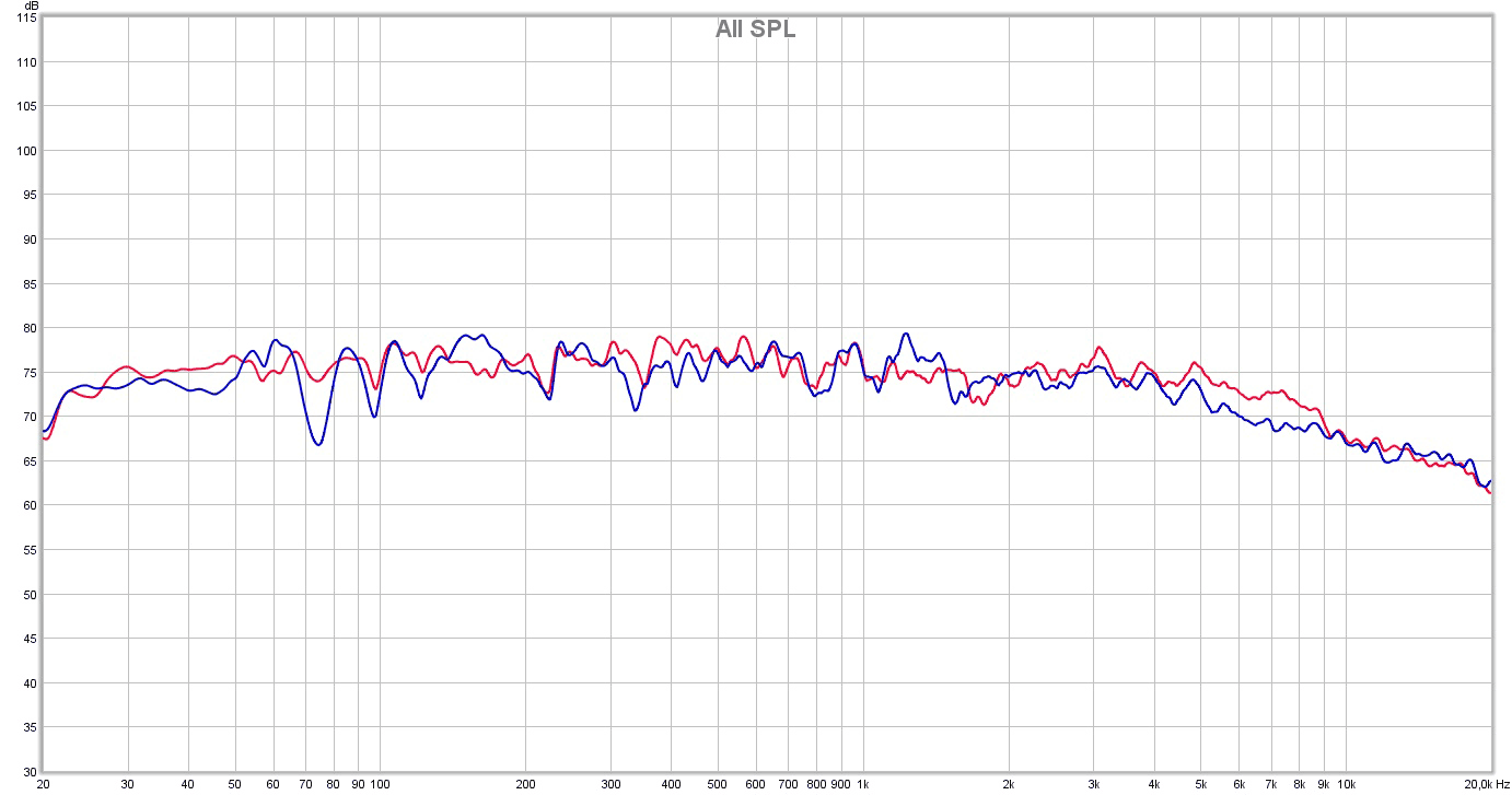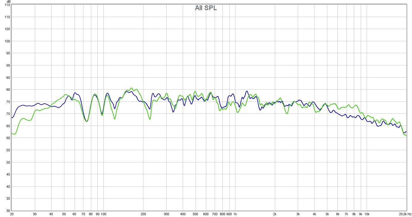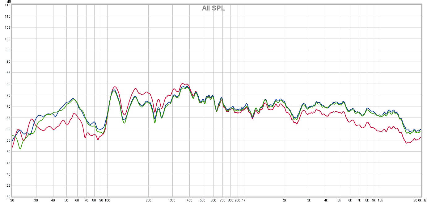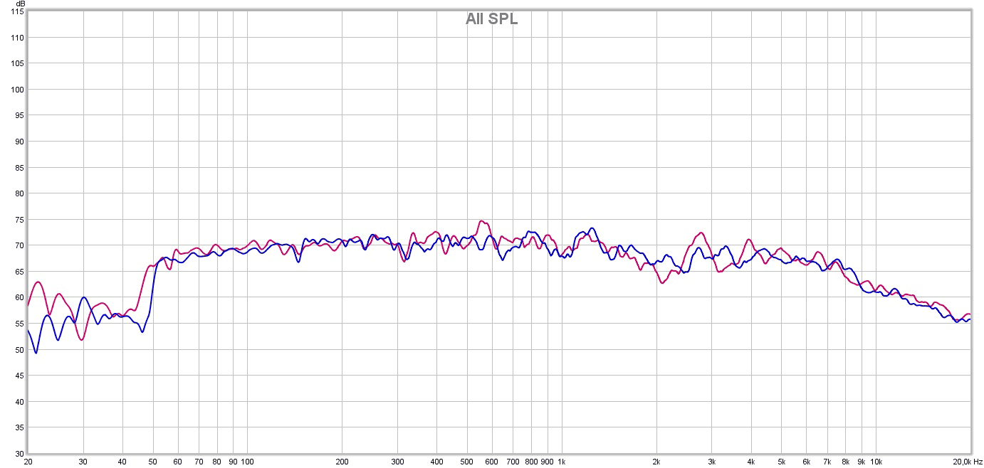 Графики систем MCACC и YPAO практически совпадают в области частот от 100 Гц до 800 Гц, далее до 3 кГц в YPAO наблюдается небольшой провал — видимо, связанный с тем, что тыловые каналы правятся лишь минимально. В области работы сабвуфера разница порядка 7 дБ, чему пока тяжело дать объяснение. Возможно, разница связана с ошибками замеров, либо какие-то каналы были установлены у системы MCACC в Large (без среза на сабвуфер), или, возможно, системы по-разному отрабатывают разложение стереосигнала одновременно на 5 каналов.