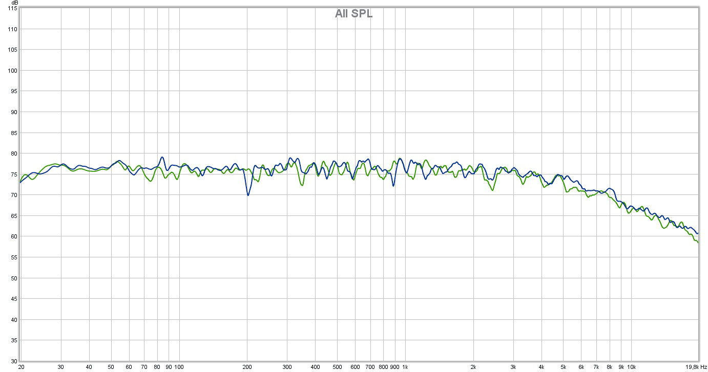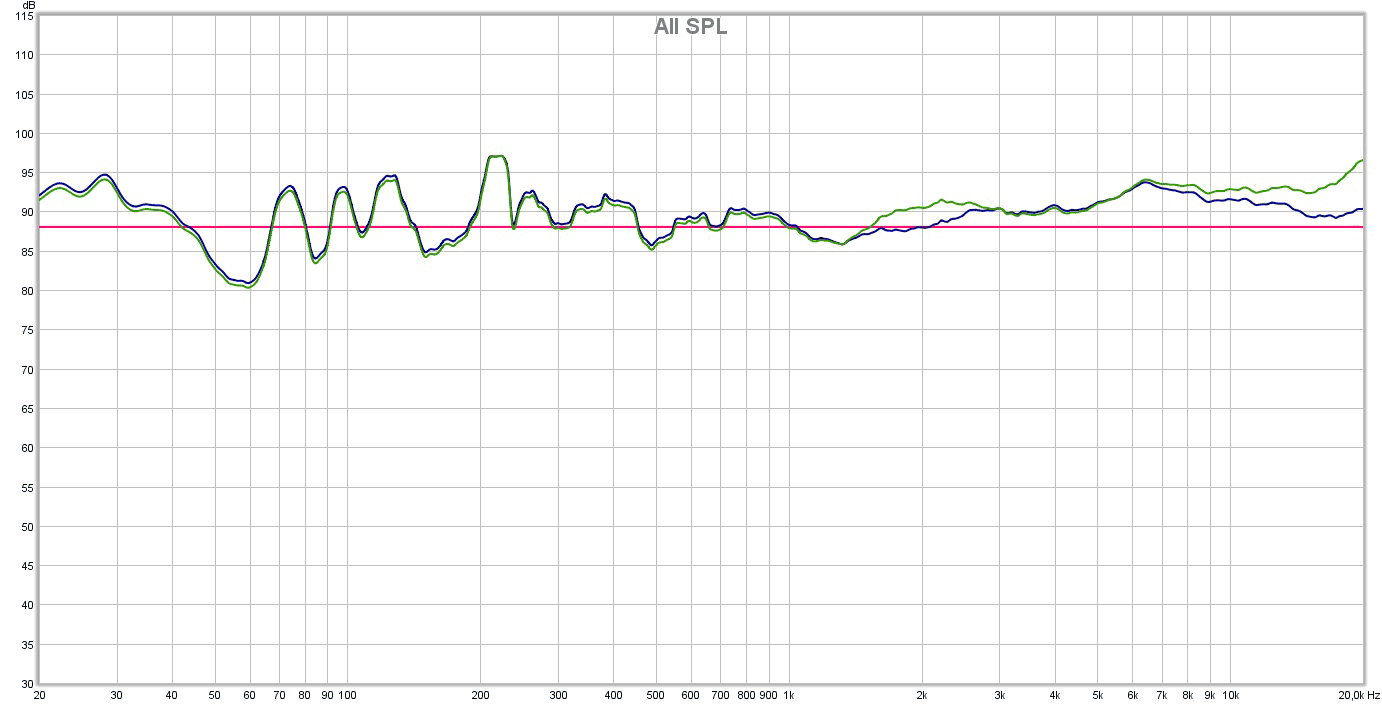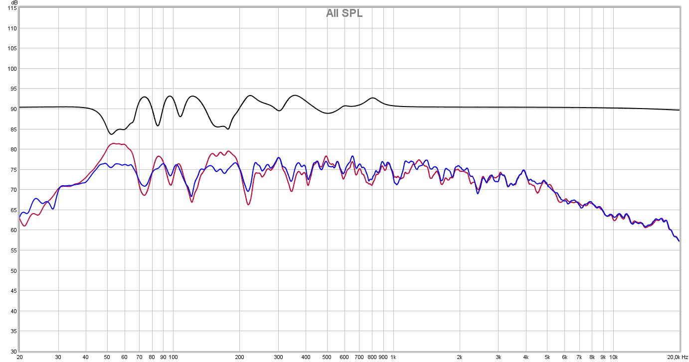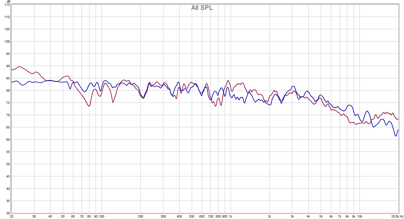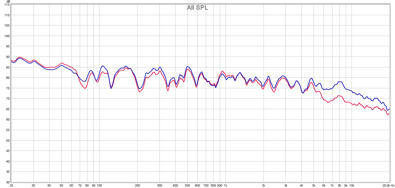 Графики систем MCACC и YPAO практически совпадают в области частот от 100 Гц до 800 Гц, далее до 3 кГц в YPAO наблюдается небольшой провал — видимо, связанный с тем, что тыловые каналы правятся лишь минимально. В области работы сабвуфера разница порядка 7 дБ, чему пока тяжело дать объяснение. Возможно, разница связана с ошибками замеров, либо какие-то каналы были установлены у системы MCACC в Large (без среза на сабвуфер), или, возможно, системы по-разному отрабатывают разложение стереосигнала одновременно на 5 каналов.