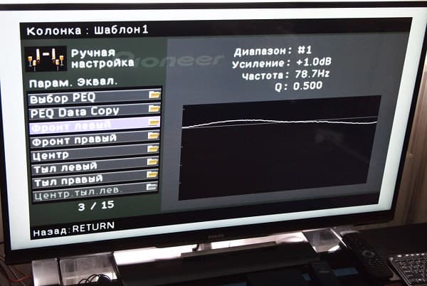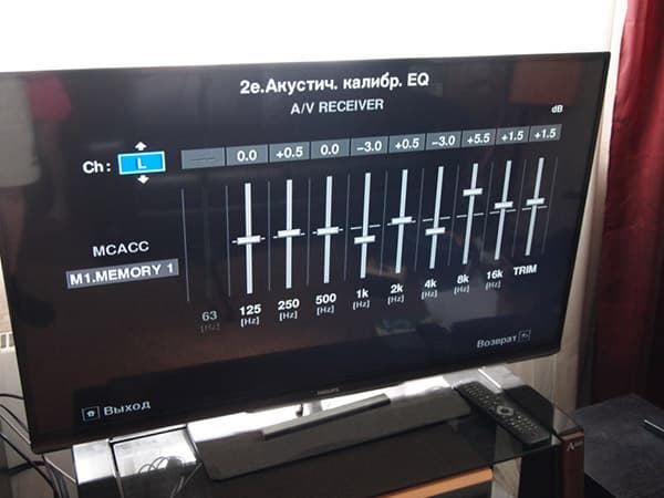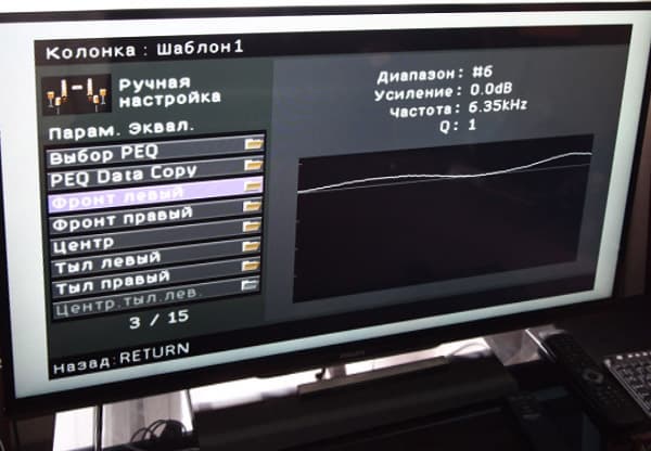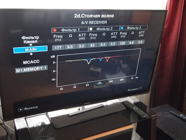 Фактически в этой базовой системе нет коррекции под помещение, влияние которого проявляется в основном в области низких частот. Коррекция возможна только вручную с помощью встроенного графического эквалайзера, который включается только при выключении в меню использования настроек правки АЧХ системой Audyssey. И если вам повезло, и единственный горб в ваших условиях находится ровно на частоте 63 Гц, то он будет эффективно устранен вручную. В других случаях широкое влияние и фиксированная частота графического эквалайзера не позволит убрать горбы на АЧХ, не затронув соседние участки. Для канала сабвуфера может использоваться эквалайзер с более низкой сеткой частот, но опять же частоты фиксированные и могут не совпасть с проблемными в вашей комнате.