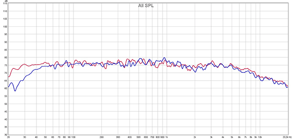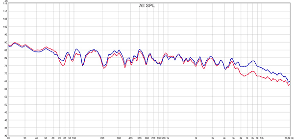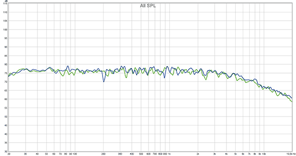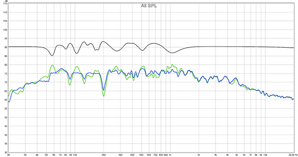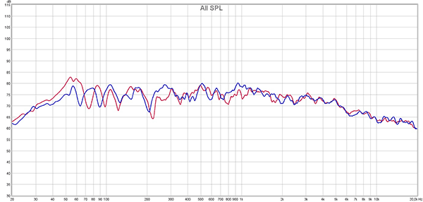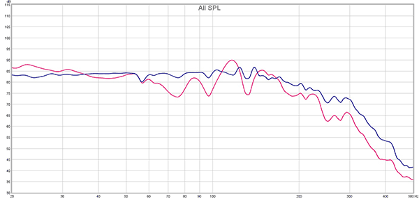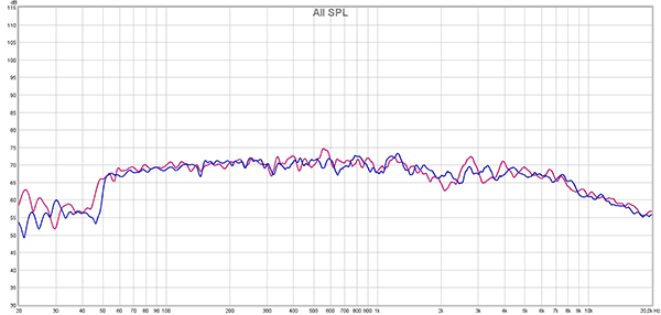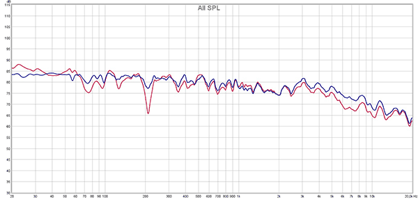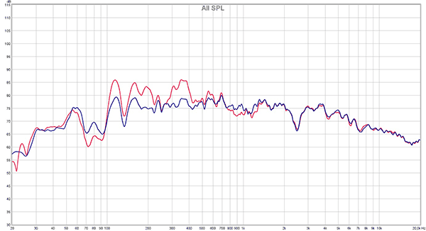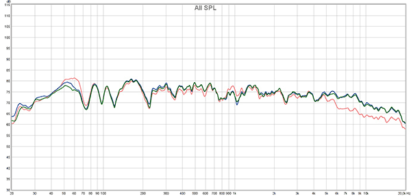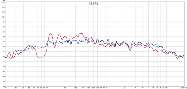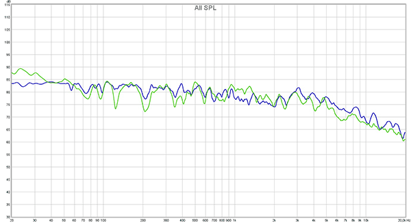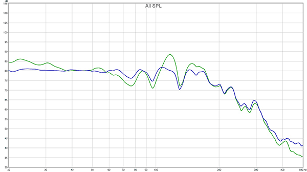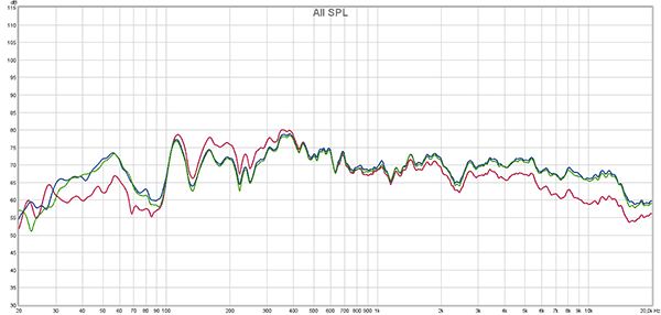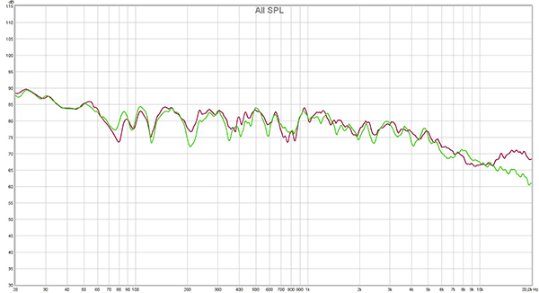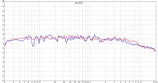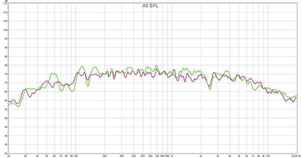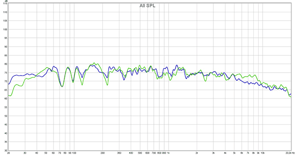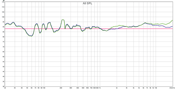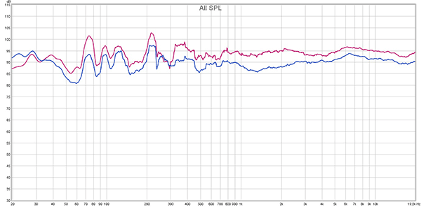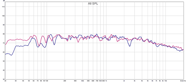 Правка НЧ-области системой Audyssey более точная, и график АЧХ более линеен за счет среза пиков и вытягивания провалов. Так же как и YPAO, система Audyssey пытается вытянуть АЧХ ниже 40 Гц за счет усиления сигнала. На частотах около 6 кГц у Audyssey видится подъем, который на слух ощущается как более «открытое» звучание. В остальном графики очень похожи.