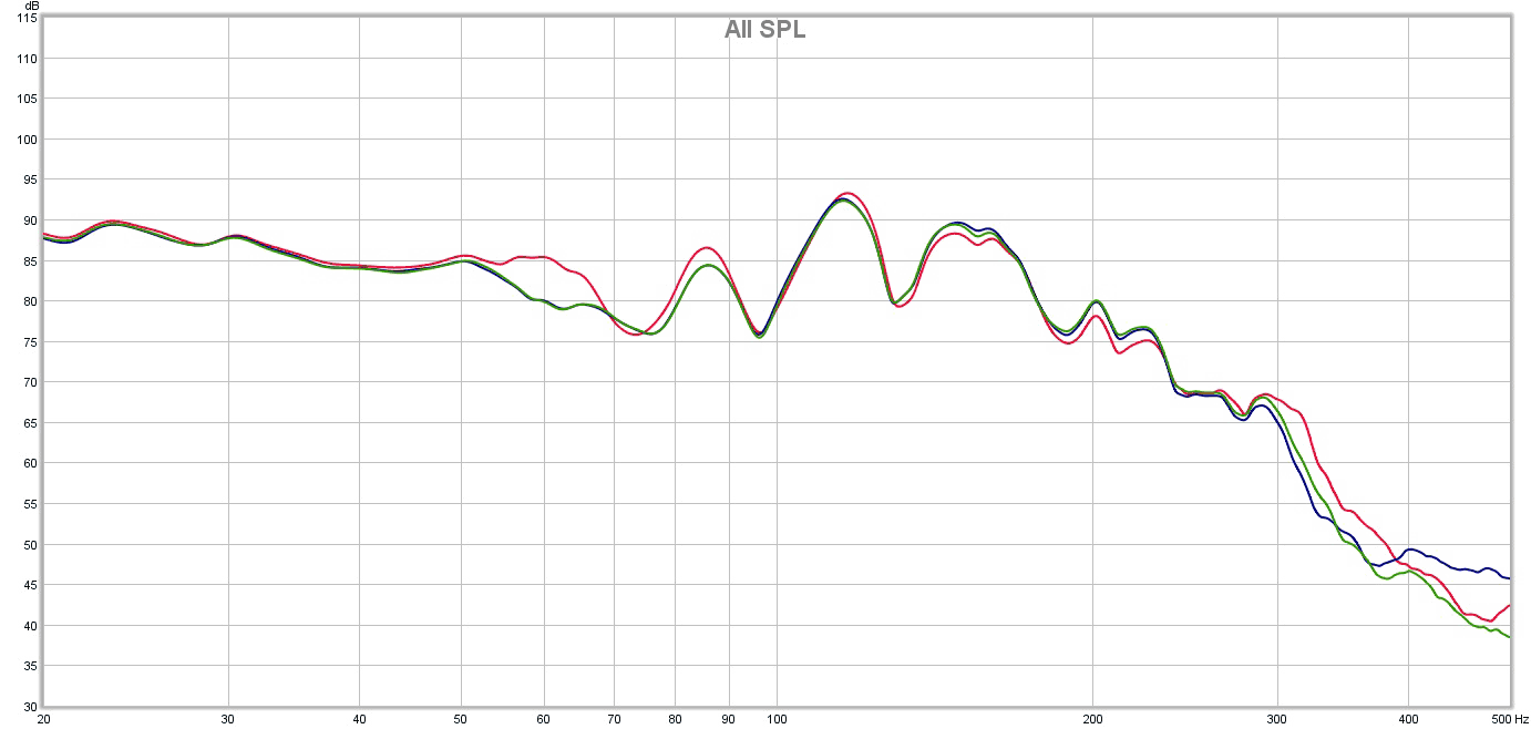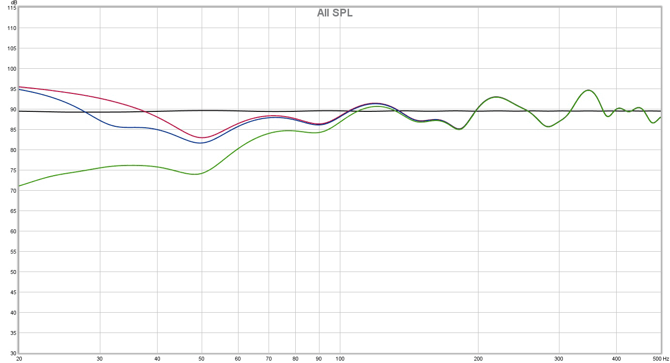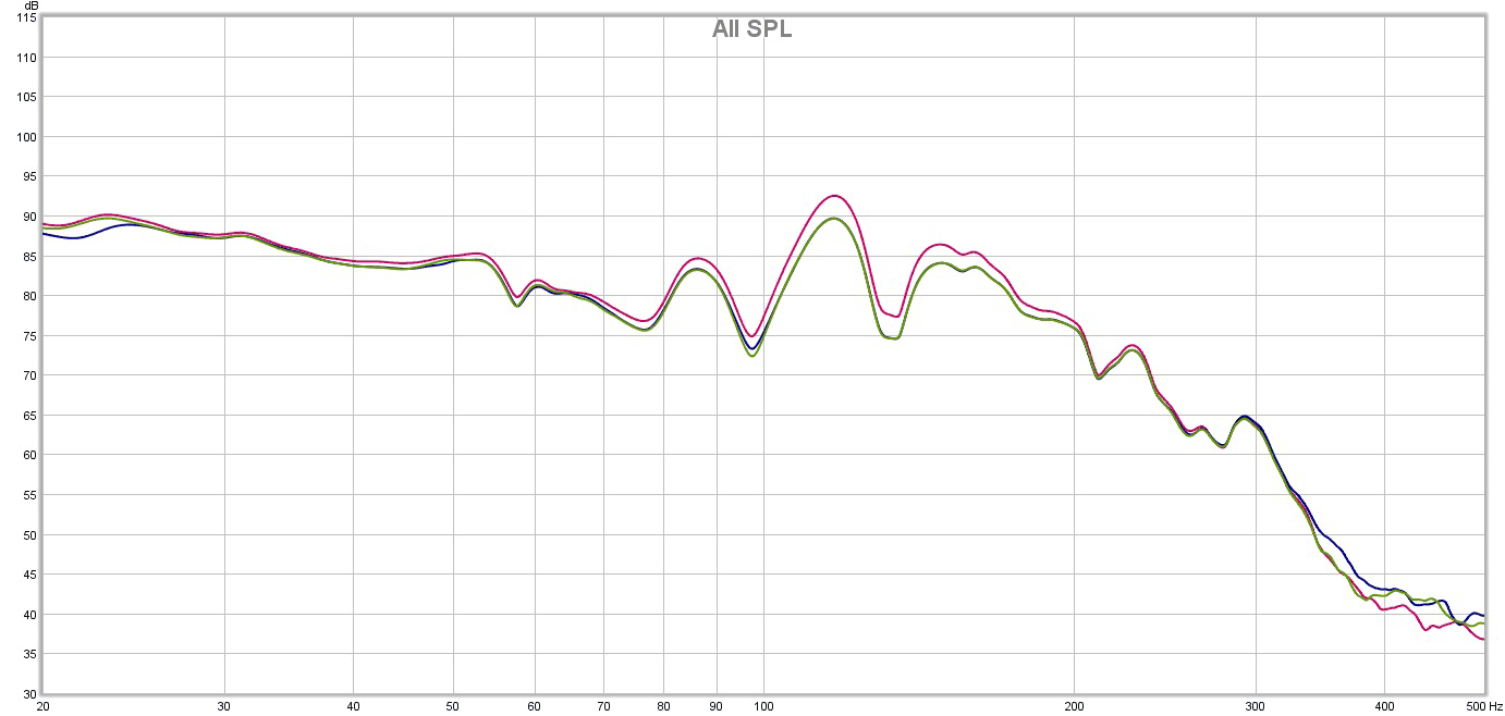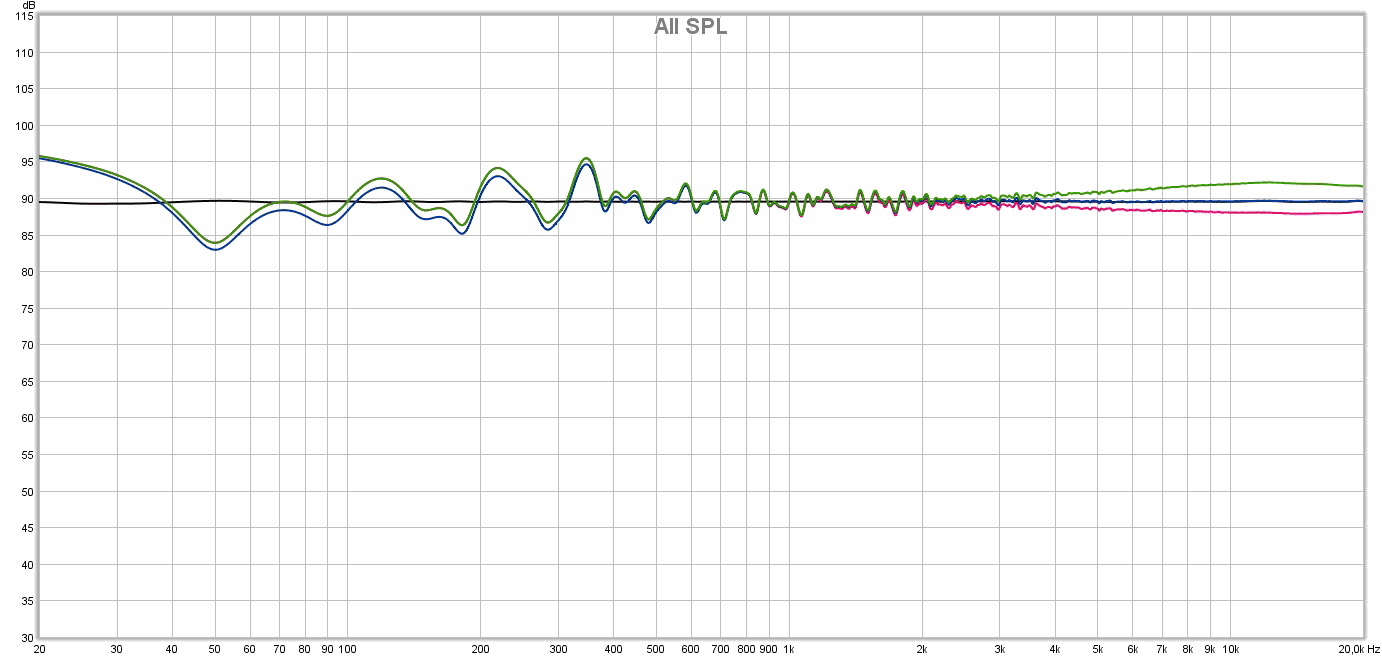 Симуляция влияния комнаты на итоговую АЧХ при подключении фронтальных АС и сабвуфера достаточно близка к реальности, что было получено в результате последующих замеров: