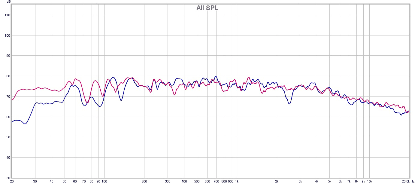 В области НЧ все очень похоже, т. к. правка обеих систем минимальна, но график YPAO выглядит немного лучше за счет вытягивания некоторых провалов. На частотах ниже 40 Гц система YPAO пытается вытянуть АЧХ за счет дополнительного подъема, что выглядит достаточно красиво, и на небольшой громкости это даже приятно на слух, но вот включать музыку на повышенной громкости с такой правкой не рекомендуется из-за возможной перегрузки усилительной части и искажений со стороны НЧ-динамика.