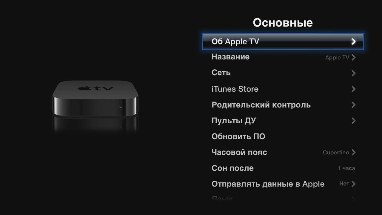 Но сначала посмотрим на меню настроек. Всего в нем шесть разделов. Главным из них является «Основные». Статус устройства включает в себя версию прошивки, серийный номер, сетевые адреса и режим видеовыхода. Если устройств в сети несколько, будет полезной опция по изменению сетевого имени. Выбор типа сетевого подключения осуществляется автоматически — если отключить кабель, то Apple TV переключится на Wi-Fi. IP-адреса удобнее всего получать по DHCP, но есть опция и ручной установки.