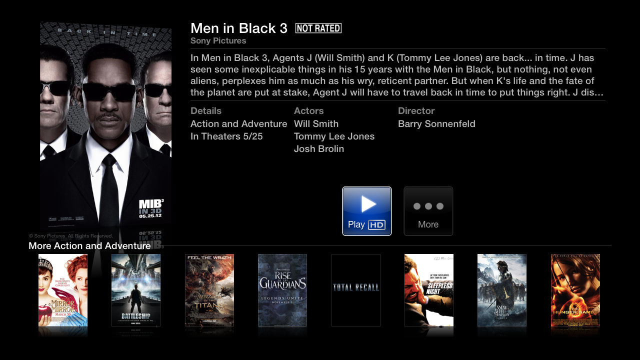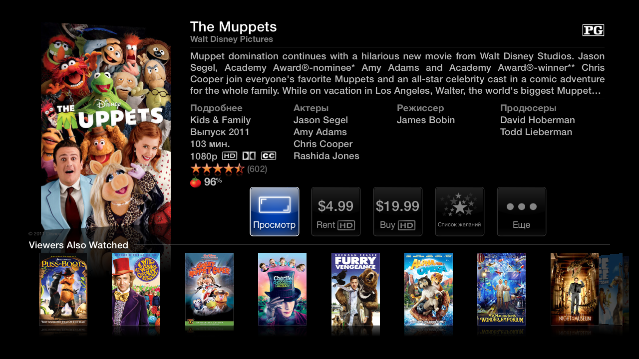 Для покупки даже не нужно использовать ПК — все действия можно осуществлять прямо с Apple TV или других устройств со встроенным магазином iTunes. Каталог на экране выглядит великолепно — представлена подробная информация о фильме, включая трейлер, рейтинг, краткое описание, список актеров, режиссер, продюсер. Причем по последним можно осуществлять поиск других фильмов.