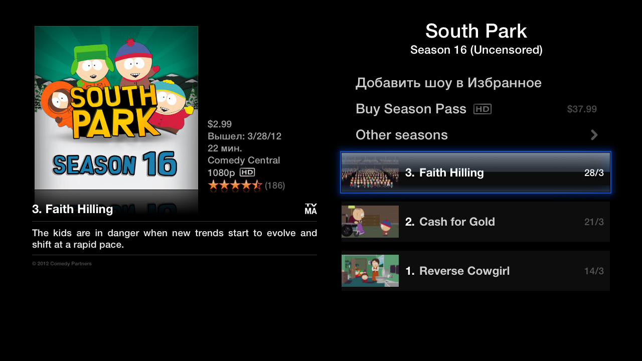 Сериалы можно только покупать, причем как отдельными сериями, так и подписками на сезон. Стоимость HD-версии одной серии может составлять $2,99.