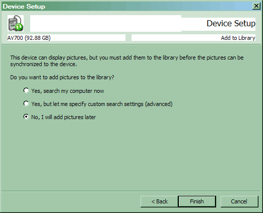 Поскольку ранее плееров с поддержкой отображения картинок у меня не водилось, последних в базе WMP не было. Пришлось понаблюдать еще одно окно, предложившее их добавить для синхронизации с плеером. Проще всего на первый раз отказаться, хотя можно и поискать на компьютере подходящие файлы. Хотя их, на мой взгляд, лучше вручную добавлять. Поддерживаются, кстати, все тот же BMP и JPEG (непрогрессивный) — фотографии знакомым и родным демонстрировать можно, благо экран большой, да и телевизор подключить не проблема.