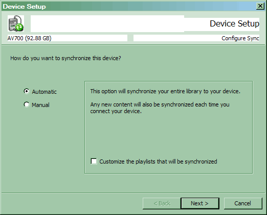 При первом подключении нового MTP-устройства к компьютеру необходимо настроить режим синхронизации файлов, причем для данного конкретного устройства: при использовании нескольких плееров с поддержкой PFS настройки могут быть разными. Самым простым вариантом является автоматическая синхронизация, тем более что в данном случае отсутствующие в музыкальной базе компьютера треки все равно с плеера не удаляются (заметное отличие от iTunes — там подобная «зачистка» нередко портила жизнь тем, у кого компьютеров несколько).