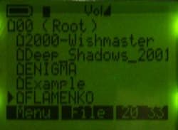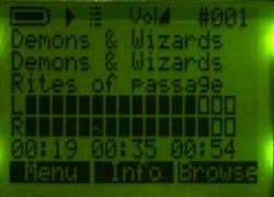 Воспроизводятся только файлы в текущей директории, то есть нажать кнопку и прослушать все содержимое жесткого диска не получится, однако это можно организовать с помощью плейлистов. Собственно говоря, в Archos Jukebox Recorder это единственный инструмент для организации нужной вам последовательности воспроизведения композиций, хотя, конечно и не самый удобный, особенно если вы храните на диске пару сотен композиций. Во время воспроизведения вы можете, не прерывая музыки, получить информацию о файле, попасть в меню настройки или в содержимое диска.