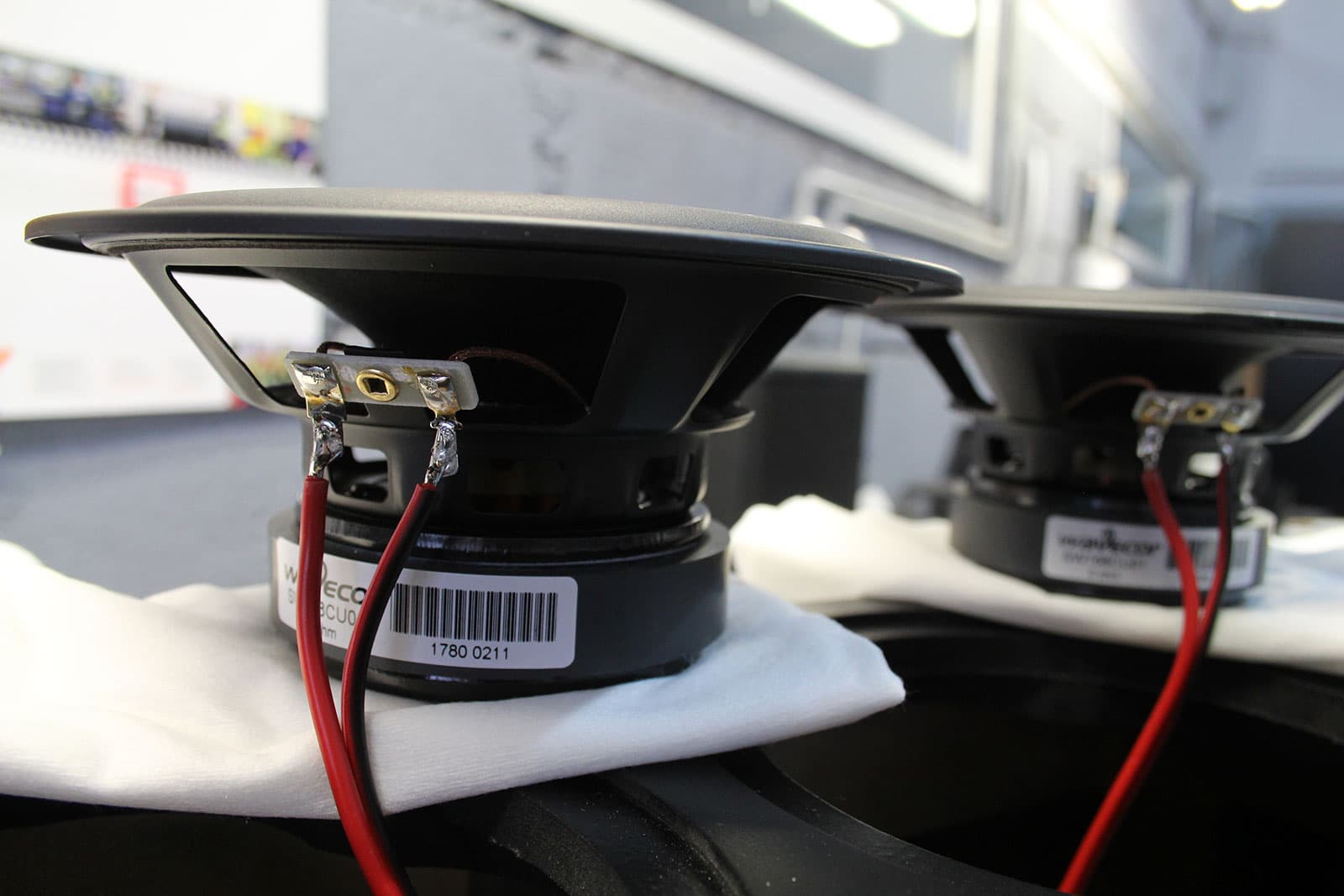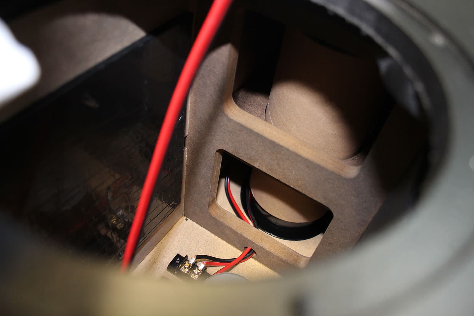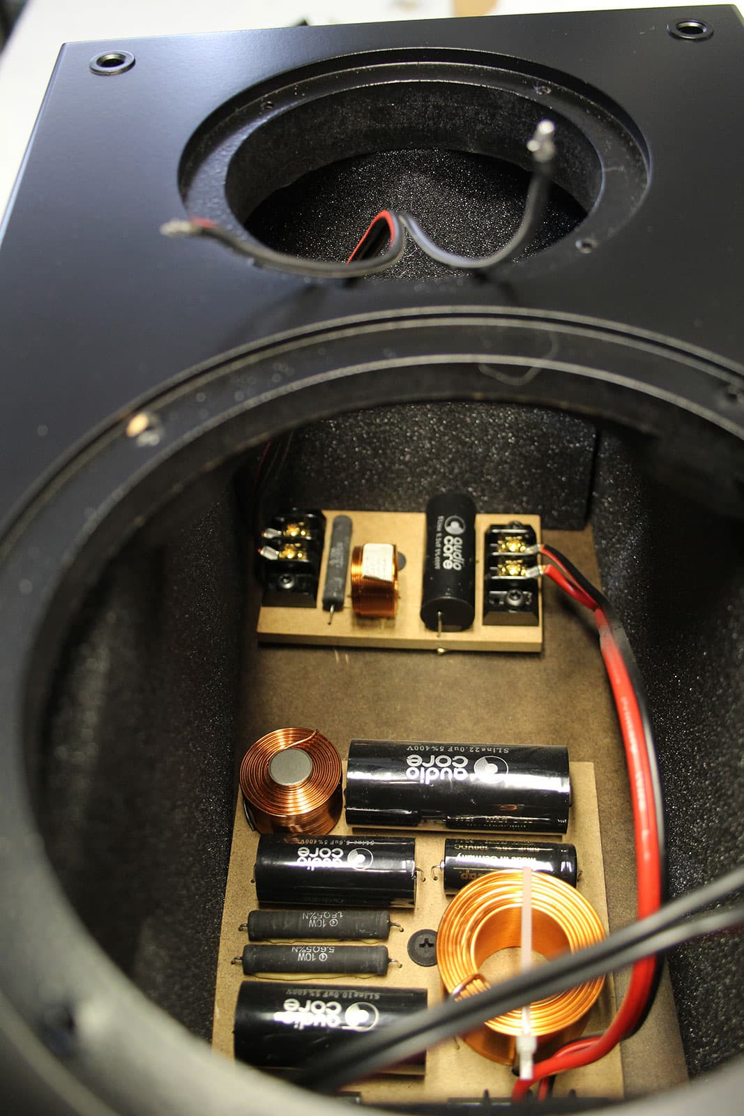 После фотосессии трудно отказать себе в удовольствии посмотреть на внутреннее устройство колонок. Общее впечатление — аккуратность сборки, грамотно спроектированный кроссовер, собранный методом навесного монтажа с использованием проводников диаметром в один миллиметр. Элементная база — датские катушки Jantzen, полипропиленовые конденсаторы Mundorf, также можно увидеть детали бренда, принадлежащего Аудиомании — Audiocore.