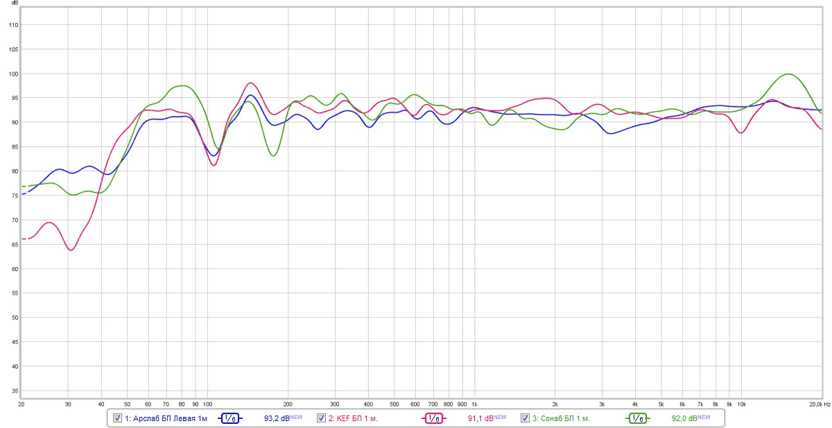 Для проверки природы возникновения провала в районе 100 Гц и последующего подъема в районе 150 Гц были замерены в тех же условиях еще 2 колонки (KEF Xq40 и Sonab B32), и график на этих частотах получился похожим. Из чего можно сделать вывод, что полностью избавиться от влияния помещения, даже при замерах в ближнем поле, нам не удалось.