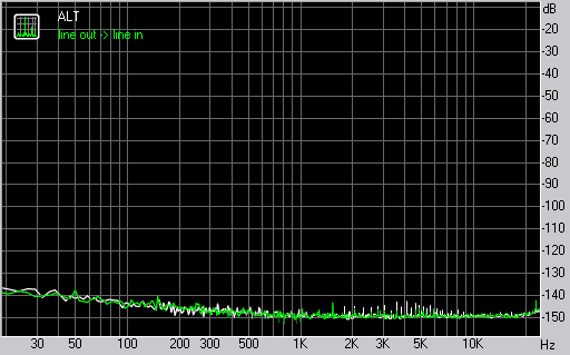 Можно похвалить карту за аналогичные результаты в режиме ALT (когда используется внутренний посыл с ЦАП на АЦП) vs. тестирование через внешний провод. В обоих случаях динамический диапазон — на высоком уровне, более 116 дБА! Это подтверждает высокое паспортное значение около 118 дБА, отдельно для входа и выхода. В тех же условиях X-Fi Elite Pro показывает более 114 дБА, что, в свою очередь, убеждает в паспортных 116 дБА.