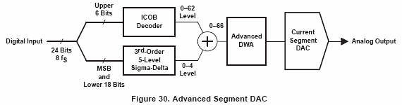 24-битные данные на входе разделяются на 6 верхних и 18 нижних бит. Первые преобразуются в код ICOB (inverted complementary offset binary, дополняющий смещенный код). Оставшиеся 18 бит, содержащие MSB, поступают на пяти-уровневый дельта-сигма модулятор 3-го порядка, работающий по-умолчанию с 64-кратным оверсемплингом. Единичный уровень модулятора равен младшему значащему биту ICOB конвертора. Данные суммируются в 0-66-уровневый цифровой код и поступают в блок DWA (data-weighted averaging, осреднение взвешенных данных) для уменьшения шума рассогласования. Далее, данные преобразуются в аналог в дифференциально-токовом цифро-аналоговом преобразователе.