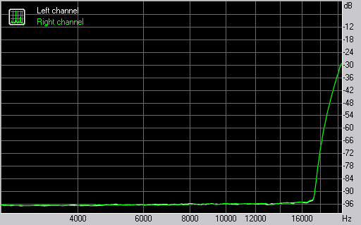 Подъем интермодуляционных искажений на частотах, близких к Fs/2, объясняется проникновением недофильтрованного в полосе подавления зеркального образа сигнала. Это хорошо видно, если запустить тест CCIF IMD вместо SMPTE, установленного в RMAA по-умолчанию. Проблема возникает только с 17 кГц и не представляет большой опасности для сигнала. На таких частотах мощность сигнала в реальных композициях намного меньше, чем в синтетическом тесте. К счастью, на слух данная особенность не фиксируется.