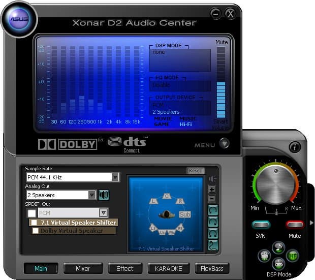 Xonar D2 Audio Center — контрольная панель карты с включением/отключением режимов обработки