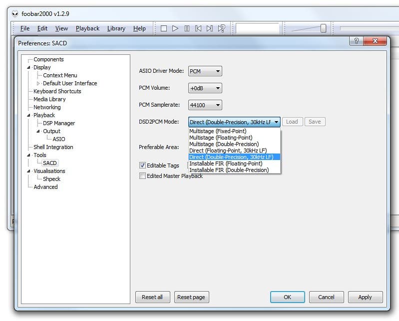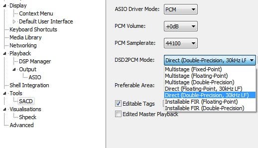 Первое, что вызвало наше удивление — существенно разная громкость DSD- и PCM-вариантов одной и той же фонограммы. Второе: плагин конвертации DSD→PCM предлагает слишком много разных опций, и лучший вариант абсолютно неясен. Третье: звучание в целом не отличается. Но хотя в деталях PCM и звучит более сглаженно, из звука пропадает агрессия и часть деталей стереопанорамы DSD. Непонятно, насколько качественно и без ошибок реализован пересчет форматов, а также в какое именно PCM-пространство он выводится. По косвенным признакам, это 16 бит 44 кГц. Неясно: почему выбран именно такой формат и почему его нельзя изменить? Почему в одном медиаплеере одни параметры конвертации, в другом они вовсе отсутствуют? Отсюда проясняется главный смысл прямой подачи DSD-потока на ЦАП: избежать какого бы то ни было вмешательства в сигнал. В любом случае приятнее иметь выбор. В прямом DSD-прослушивании, безусловно, есть свой шарм. И отличия тут явные. (Вся затея в целом намного здоровее, чем традиционные аудиофильские забавы с подбором ориентации сетевого кабеля 220 В.)