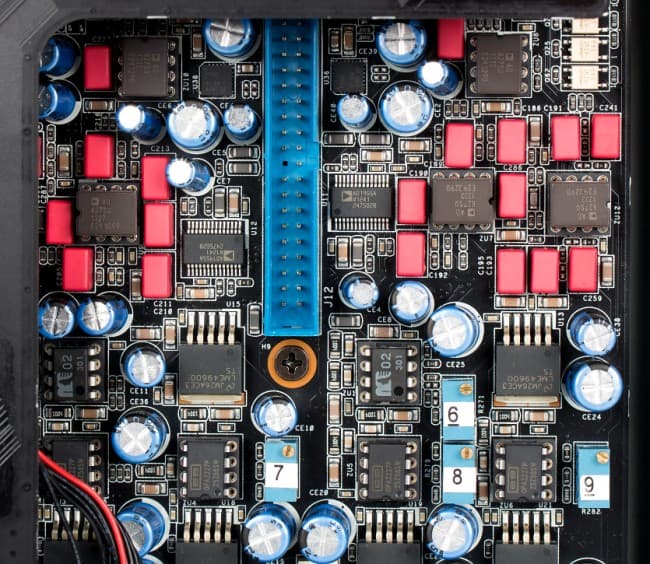 В преобразователях ток/напряжение и ФНЧ применены 6 высококлассных керамических операционных усилителей Analog Devices AD827SQ. Усилитель для наушников имеет дискретную реализацию на базе мощного токового драйвера. TRS-выход ОУ Muses 02 в связке LME49600, miniXLR-выходы OPA2227P, плюс те же буферы LME49600.