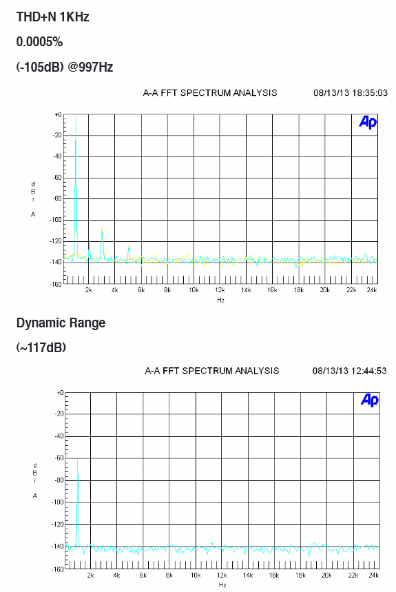 По измерениям нет никаких сюрпризов. Asus комплектует устройство паспортом с графиками, полученными на самом дорогом измерительном оборудовании из существующего (Audio Precision SYS-2722). Паспортные данные THD+N 0,0005%, SNR 117 дБ подтверждаются измерениями в RMAA через линейный вход карты E-MU 1616M.