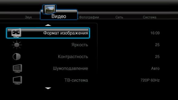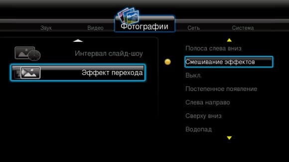 Вторая страница — параметры видеовыхода. Здесь можно установить формат экрана (16:9 и два варианта 4:3), подстроить яркость и контрастность, отключить шумоподавление, установить режим видеовыхода (от 480i до 1080p) и активировать 1080p24. Еще два параметра относятся к организации работы с файлами — запоминание позиции в файле и предварительный просмотр в окне. Следующая страница — интервал показа фотографий и эффект перехода для слайдшоу. Эффектов, кстати, достаточно много — целых восемь. Есть и режим их случайного выбора.