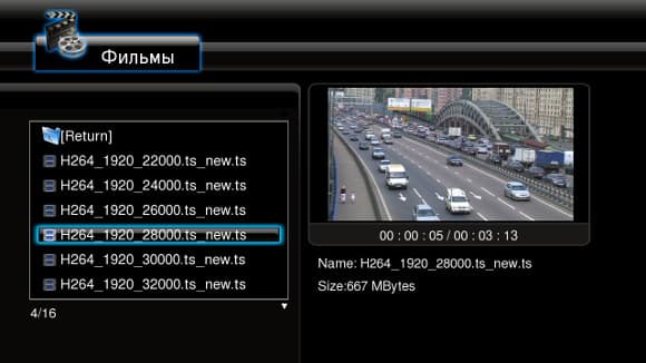 И, как обычно, напоследок видео — самое интересное. Для этого типа мультимедиа также есть перемотка и увеличение. Причем на перемотке вперед на скоростях 1,5x и 2x плеер старается сохранить и звуковую дорожку, пересчитывая ее «на лету» на новую скорость. Это может быть интересно, если вам попалась ну уж очень занудная видеозапись :). По кнопке Diplay на экран можно вывести название файла и текущую длительность. Если данный файл уже начинали смотреть, то будет предложено продолжить с места остановки. Для некоторых типов файлов и кодеков (в частности ts, m2ts и mov) есть автоопределение режима 24p (если включено в настройках). В этом случае при воспроизведении видео выход на телевизор переключается на 1080p24 и картинка выглядит просто идеально.