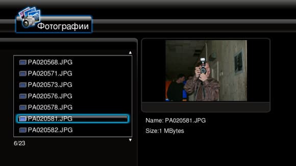 Конечно самое интересное это работа с видео, так что по фотографиям и музыке пробежимся быстро. Изображения могут быть в форматах jpeg, bmp, png, gif, tiff. В режиме просмотра фотографий, их можно поворачивать и увеличивать. Информация из exif не выдается. Можно узнать только название файла. Музыкального сопровождения не предусмотрено. Собственно качество отображения фотографий очень высокое, особенно если смотреть их по HDMI на FullHD устройстве.