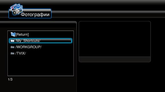 Работа с файлами начинается с домашнего экрана. Для его быстрого вызова можно использовать выделенную кнопку на пульте. Далее следует определиться с типом контента — фотографии, музыка или видео. Или через меню или также кнопками на пульте. Формально этот выбор просто включает фильтр для отображаемых файлов. И может быть быстро изменен не выходя из директории этими же кнопками, без изменения текущего места поиска файлов, что очень удобно. Русские имена файлов работают и по сети, и на локальных носителях.