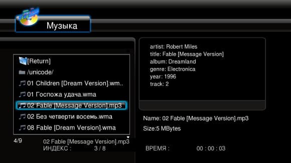 Единственная настройка сети — установка IP-адреса или включение DHCP. Последняя страница — системные параметры. Здесь можно выбрать язык меню, кодировку текста, проверить версию прошивки и обновить ее, настроить встроенные часы, включить хранитель экрана и сбросить все настройки на заводские. Выбор кодировки влияет на чтение тегов и субтитров. Наиболее удобный вариант — «кириллица». В этом случае правильно отображаются и теги, и субтитры в cp1251. Если же выбрать «Unicode(UTF8)», то все правильно будет только с субтитрами в этой кодировке или же в шестнадцатибитном Unicode, а вот теги ни при каких вариантах кодировок не будут корректно выводиться на экран.