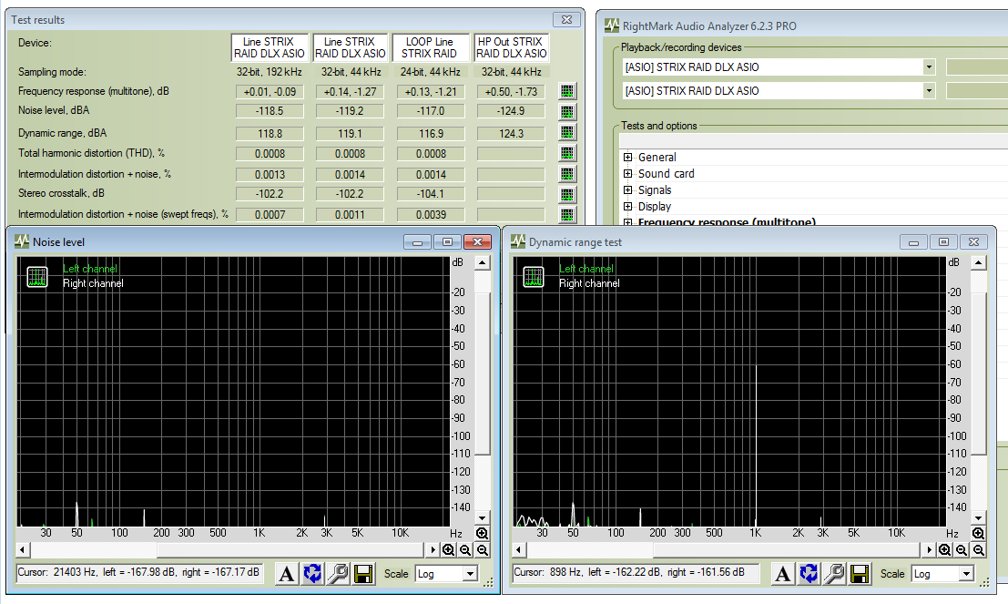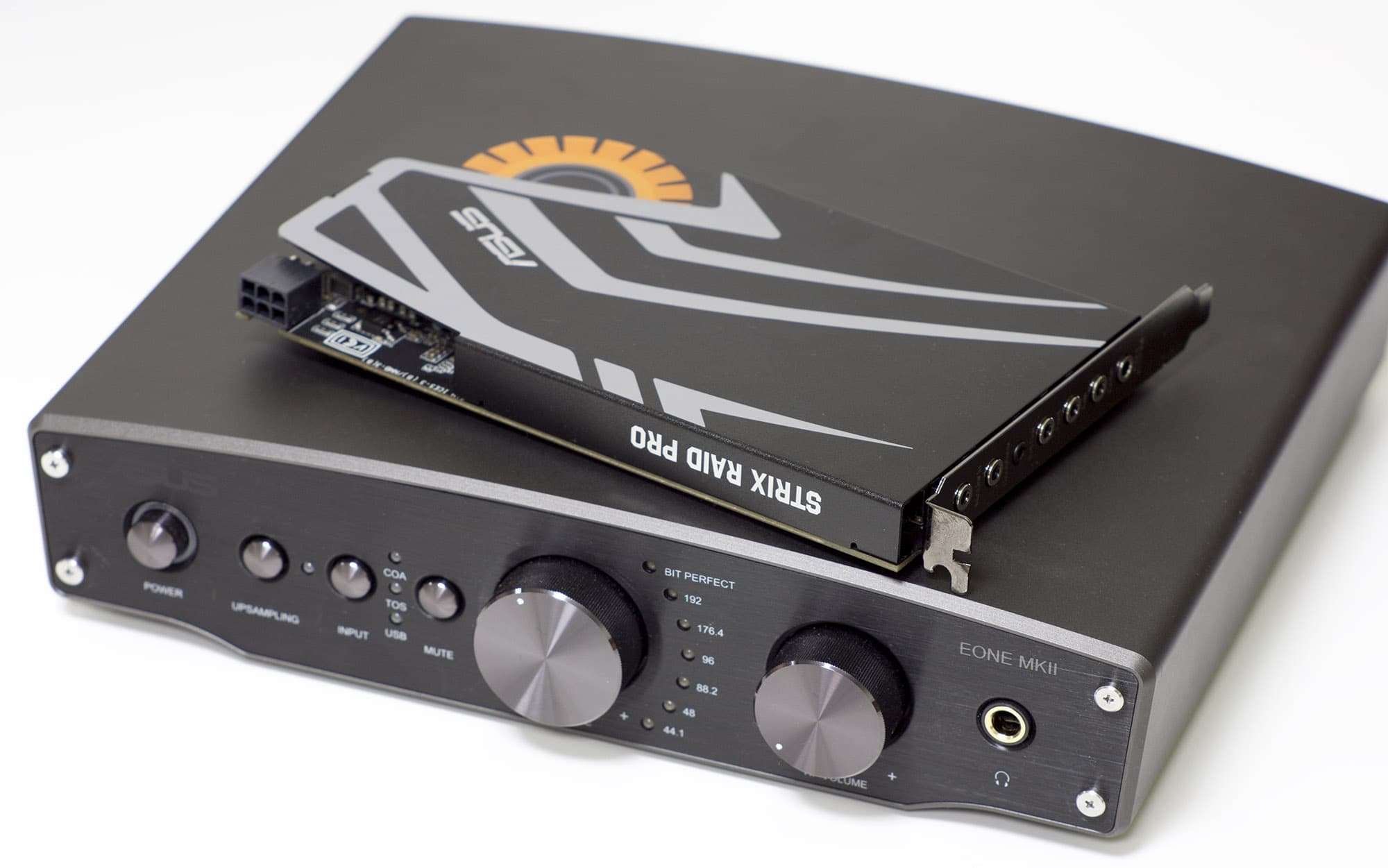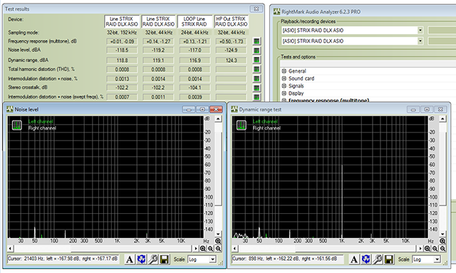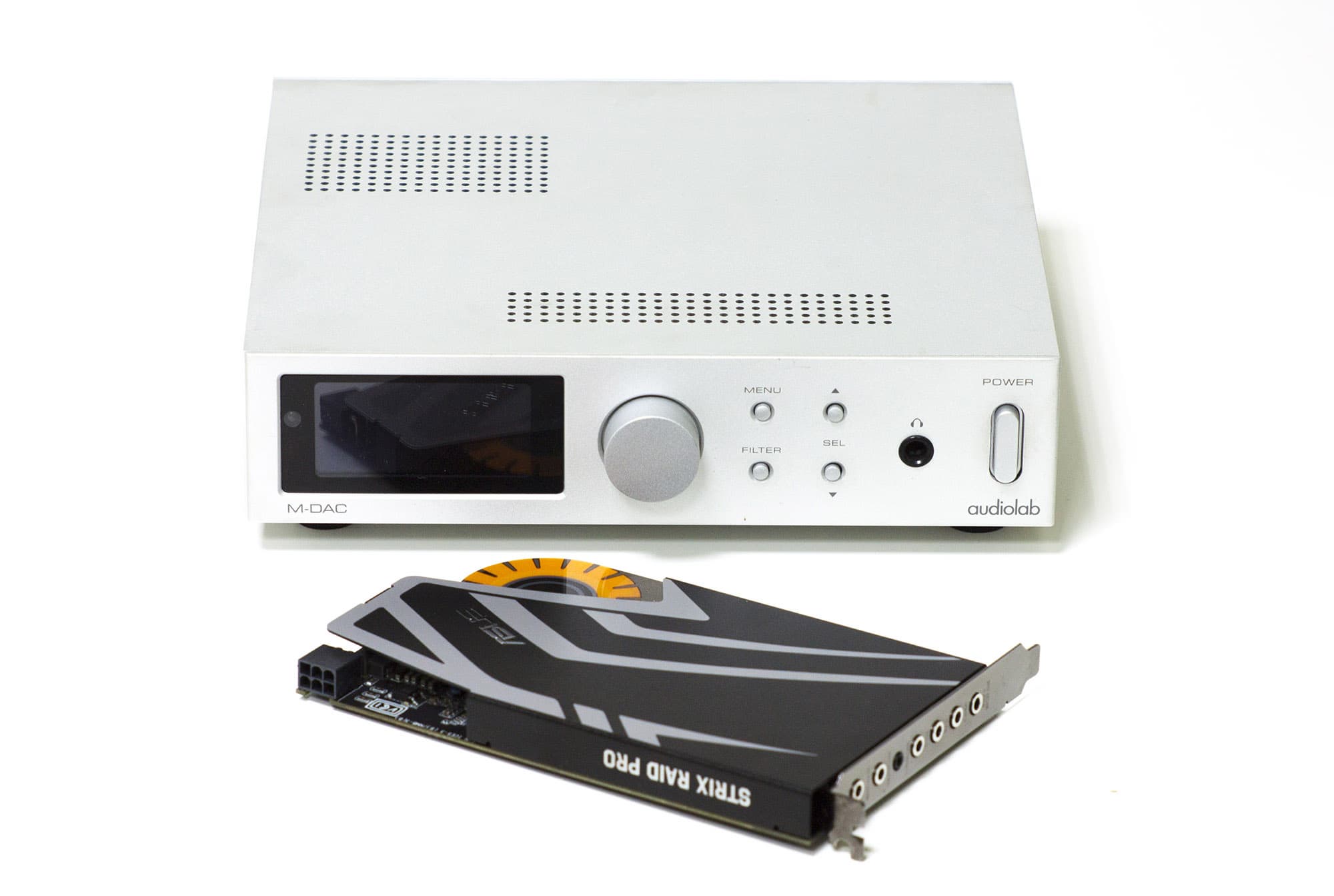 После поисков нюансов звучания в сравнении старших карт и внешних «килобаксовых» ЦАП вполне закономерно, что младшая версия Strix уступила по качеству звучания с заметным отличием. Разницу можно охарактеризовать как бо́льшая сибилятивность в высокочастотном диапазоне и менее четкая локализация звука. Если маракасы на Essence STX и Raid DLX передают движение россыпи в пространстве, то в Raid Pro это воспринимается более статично.
