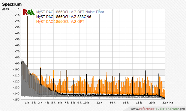 Пример искажений с NOS DAC MyST 1866OCU. Оранжевый — воспроизведение без ЦФ в 44,1 кГц, черный — апсемплинг в 96 кГц