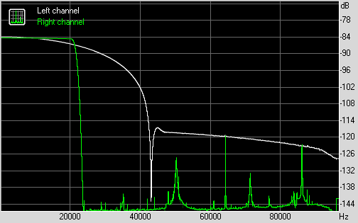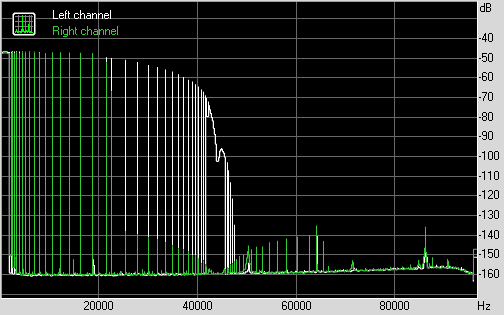 Белым дана запись с Raid DLX: в частотном диапазоне от 22 до 44 кГц с высокой амплитудой воспроизводятся отзеркаленные гармоники, которых, по идее, быть не должно. В диапазоне с 44 кГц до 48 кГц продукты алиасинга плавно подавляются.