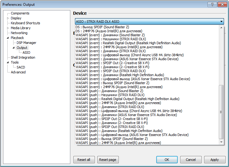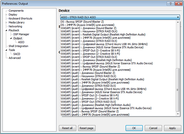 Для тех, кто качественным звуком заинтересовался недавно: вывод через WASAPI и ASIO в большинстве случаев обеспечивает побитовый звуковой поток в драйвер и соответственно дает максимально возможное качество звука. В разных системах может быть разный уровень стабильности для ASIO и WASAPI, выбирать нужно тот вывод, при котором во время воспроизведения нет щелчков.