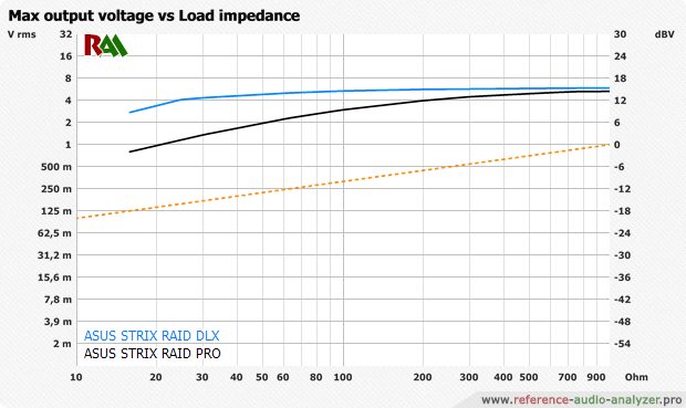 График уровня максимальной амплитуды напряжения синусоидального сигнала от нагрузки построен не только к привычному многим напряжению в вольтах, но и к логарифмическому представлению напряжения в дБВ (dBV), что облегчает оценку разницы громкости между картами и подсчет конечного уровня звукового давления с наушников. За уровень 0 dBV принимается 1 VRMS.