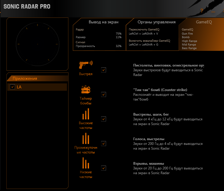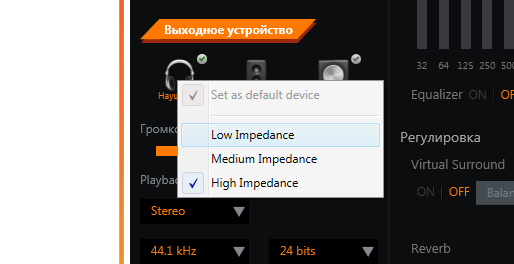 Панель управления представляет собой нечто среднее между панелью от Razer Barracuda и Phoebus. Есть разные косвенные признаки того, что драйвер изначально разрабатывается в C-Media, и наверняка есть разные концепции вида панелей для фирменных продуктов (не под OEM). Панель у Razer Barracuda привлекала тем, что количество вкладок было сведено к минимуму, все регулировалось с одной панели. У Strix ситуация похожая: практически все элементы доступны на одной панели.