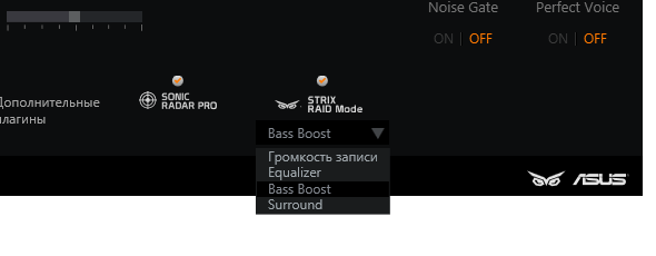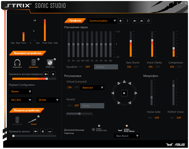 Отдельным плюсом в сравнении с семейством Xonar и Phoebus можно считать понятные регуляторы Bass Boost вместо более сложного в настройке эквалайзера, Voice Clarity для выделения голоса в фильмах и Compressor для вытягивания тихих звуков, что актуально для роликов с YouTube. Тут все аналогично эффектам у Creative — Bass, Crystalizer и Dialog Plus. Если ранее драйверы Asus проигрывали по удобству и простоте настроек драйверам Creative, то сейчас ситуация практически патовая. Остается лишь открытым вопрос, какой алгоритм у кого работает лучше.