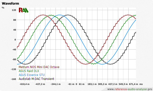 Варианты вида волны синуса у разных устройств: голубой — типовой Sharp, черный — Transient у M-DAC, красный — Metrum NOS Mini DAC Octave, и зеленый — Asus Raid DLX