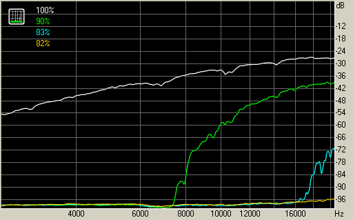 От клиппирования можно уйти, если снизить уровень громкости до ЦАП. Но надо точно знать, насколько его снижать, чтобы излишне не уменьшить динамический диапазон с понижением разрядности сигнала. Для выяснения такого уровня идеально подходит тест в RMAA CCIF на плавающих синусах. Для теста использовался сигнал с амплитудой под 0 dBFS. При воспроизведении сигнала значение регулятора громкости постепенно снижалось, и на 82% клиппирование в области высоких частот полностью исчезло.