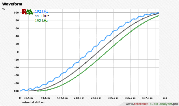 Это смелый эксперимент со стороны Asus, достойный любого аудиофильского продукта (причем из области дорогого Hi-End)! Однако добавим немного критики в адрес рекламного отдела Asus. Такой режим влечет за собой небольшой спад АЧХ в области высоких частот, что едва слышно, но странно смотрится в технических тестах и дает оценку «хорошо/средне» вместо «отлично» в RMAA. Это не недостаток, а неизбежная особенность построения сигнала «ступеньками», где из-за отсутствия аппроксимации под синус теряются пиковые значения, а часть мощности сигнала на определенной частоте «отделяется и уходит в зеркальную область» ультравысоких частот.