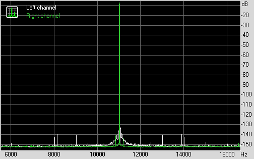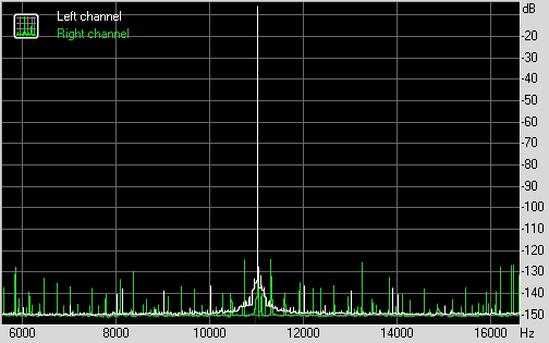 В сравнении с другими продуктами джиттер здесь крайне мал, но все же при использовании спектра в очень высоком разрешении «под микроскопом» что-то разглядеть можно. Есть отдельные тоны, кратные 1 кГц, и немного низкочастотного джиттера, образующего юбку. Широкополосного джиттера нет, уровень шумовой полки с сигналом и без полностью совпадают. Это очень хороший результат, очень близкий к «отлично».