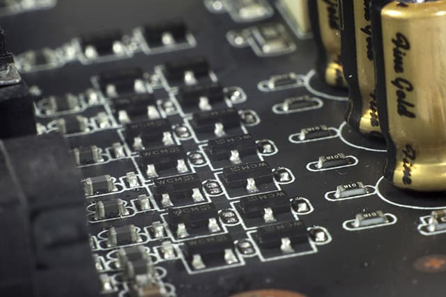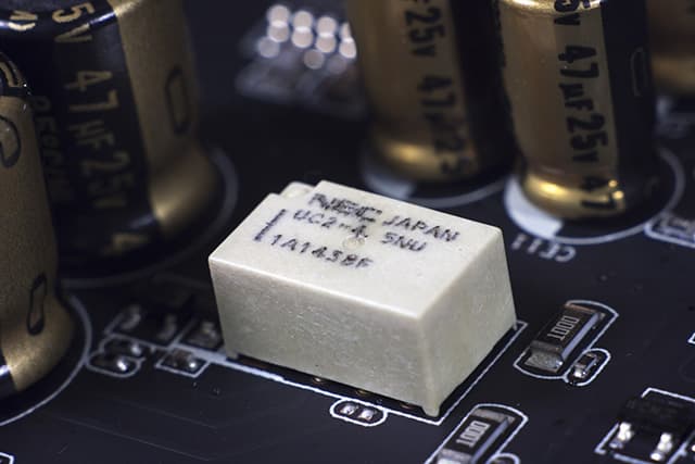После фильтра сигнал направляется на линейный выход или композитную схему усилителя. Одно реле переключает выход, а два оставшихся работают в качестве «mute»-ключей для линейного и наушникового выходов, не внося никаких искажений в сигнал.