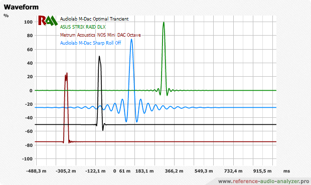 Raid DLX демонстрирует подход, похожий на решения Chord: компромисс между импульсом и синусом с разной обработкой. В импульсном сигнале высокочастотные компоненты выше 44 кГц подавляются в меньшей степени, нежели при воспроизведении многотонального сигнала. К примеру, у M-DAC при фильтрации Transient подавление одинаково для импульса, шума и многотонального сигнала.