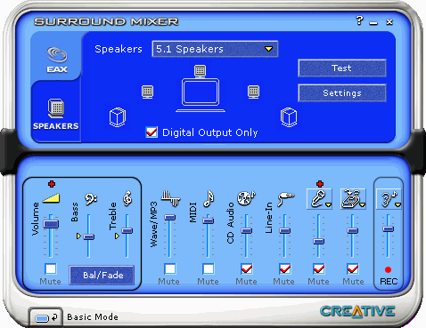 Цифровой выход в драйверах Audigy может работать в трёх режимах: 44,1 кГц, 48 кГц и 96 кГц (настраивается в утилите Device Controls). На удивление, набор акустики DTT3500, разработанный около года назад, поддерживает режим 24 бит 96 кГц и спокойненько воспроизводит в нём музыку через 6-канальный цифровой вход miniDIN! Таким образом, на момент выхода карты Audigy в свободной продаже имеются наборы акустики, которые на 100% совместимы с новыми картами во всех режимах (речь идёт от наборах DTT). Вот это действительно приятная неожиданность!