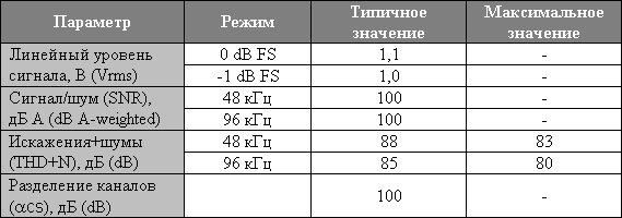 Технология работы преобразователей — bitstream, со всеми вытекающими последствиями. Поэтому не стоит удивляться одинаковым характеристикам для 48 кГц и 96 кГц и тому, что класс преобразователей остаётся бытовым. А где вы выдели профессиональную звуковую карту по цене менее $100?