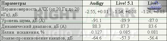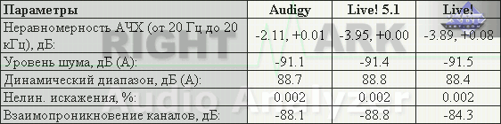 Нетрудно видеть, что более высокий коэффициент нелинейных искажений и слабые характеристики проникновения каналов с фронтального выхода не зависит от применённого ЦАПа, а следовательно является баго-фичей самого чипа EMU10K1 и Audigy. Зато сами характеристики ещё более улучшились, особенно в режиме 44,1 кГц. Параметры тылового выхода всех карт Creative в обоих режимах работы легко могут претендовать на применение в домашних музыкальных студиях. Не больше, но и не меньше.