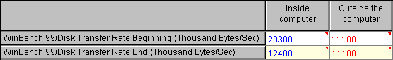 Как известно, протокол IEEE1394 может работать в режимах 100, 200 и 400 Мбит/с. Данное устройство поддерживало только 100 Мбит скорость обмена, а винчестеры эксплуатировала в режиме UDMA33, поэтому установленный внутрь HDD Quantum KA 7200 rpm согласно WinBench 99 показывал постоянную скорость обмена на уровне 10,5 Мбайт/с.
