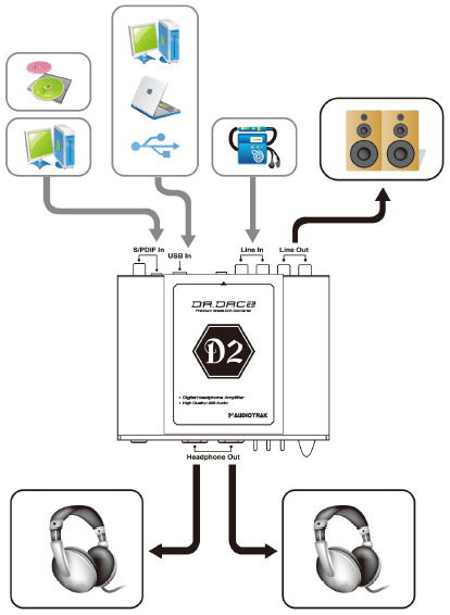 Dr.Dac2 пришел на смену первой версии Dr.Dac и представляет собой универсальное устройство, которое может работать как звуковой интерфейс (через USB), внешний ЦАП, предварительный усилитель для усилителя мощности и как усилитель для наушников.