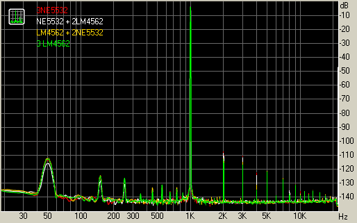 Согласно измерениям через E-MU1616m, искажения на выходе при использовании трех NE 5532 составили 0,0009%. Уровень искажений в зависимости от условий замеров (питания в сети, положения уровня громкости, наводок от внешних приборов) может изменяться в небольших пределах. Во время измерений с заменой ОУ искажения получились равными 0,0010%