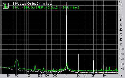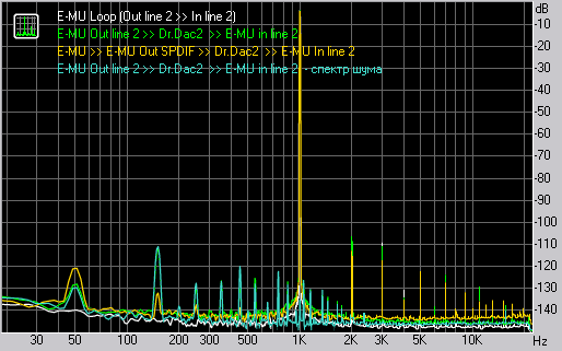 Тесты показали, что Dr.Dac2 практически не добавляет искажений, разница между спектрами искажений в собственном Loop у E-MU1616m и с Dr.Dac2 исчезающее мала (белый и зеленый спектры). Единственное, на спектре можно видеть чуть большие шумы из-за незначительной земляной петли. Чтобы это не отвлекало, спектр шума дополнительно показан голубым спектром.