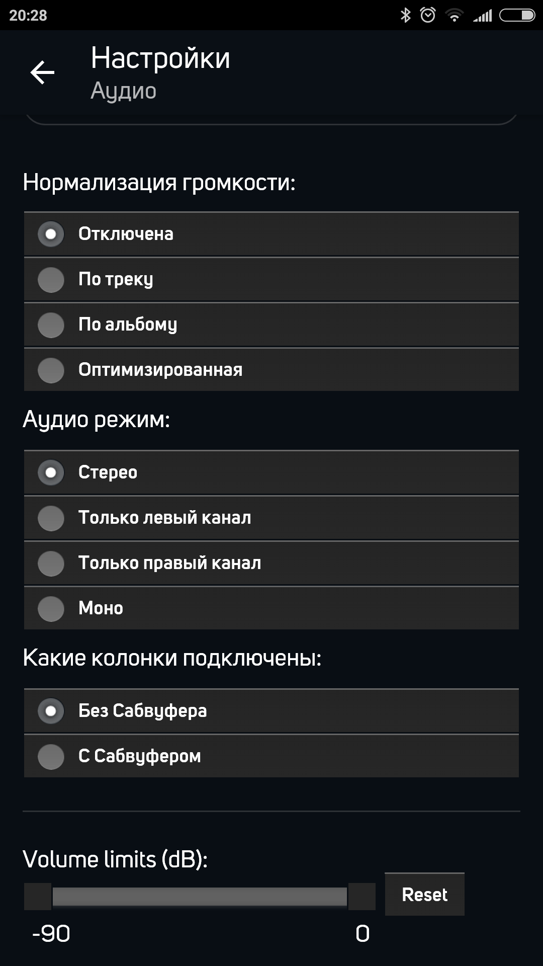 Список доступных через программу настроек включает в себя: параметры беспроводной сети (при наличии адаптера), изменение имени, настройки звука (здесь, в частности, можно включить использование сабвуфера (разделение на 80 Гц) и организовать стереорежим на двух устройствах в группе), обучение командам ИК-пульта (включая управление воспроизведением и громкостью), выбор яркости индикатора.