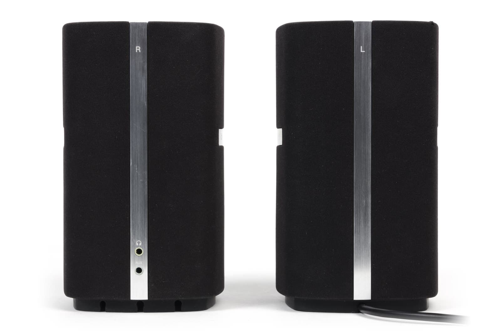 «Башенки» MM-1 имеют форму, стандартную для компьютерных колонок. Черный корпус спереди и сбоку пересекает серебристая полоска. Спереди на ней размещен логотип производителя. Маленькая точка на правом динамике — это яркий светодиод, который горит синим в активном, а красным — в standby-режиме.